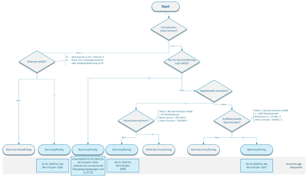 Am 11. Juli 2025 beschloss die EU-Kommission zudem Unternehmen, die bereits für das Geschäftsjahr 2024 nach den CSRD Vorgaben berichten mussten, rückwirkend zu entlasten durch zusätzliche Übergangsregelungen (7).
